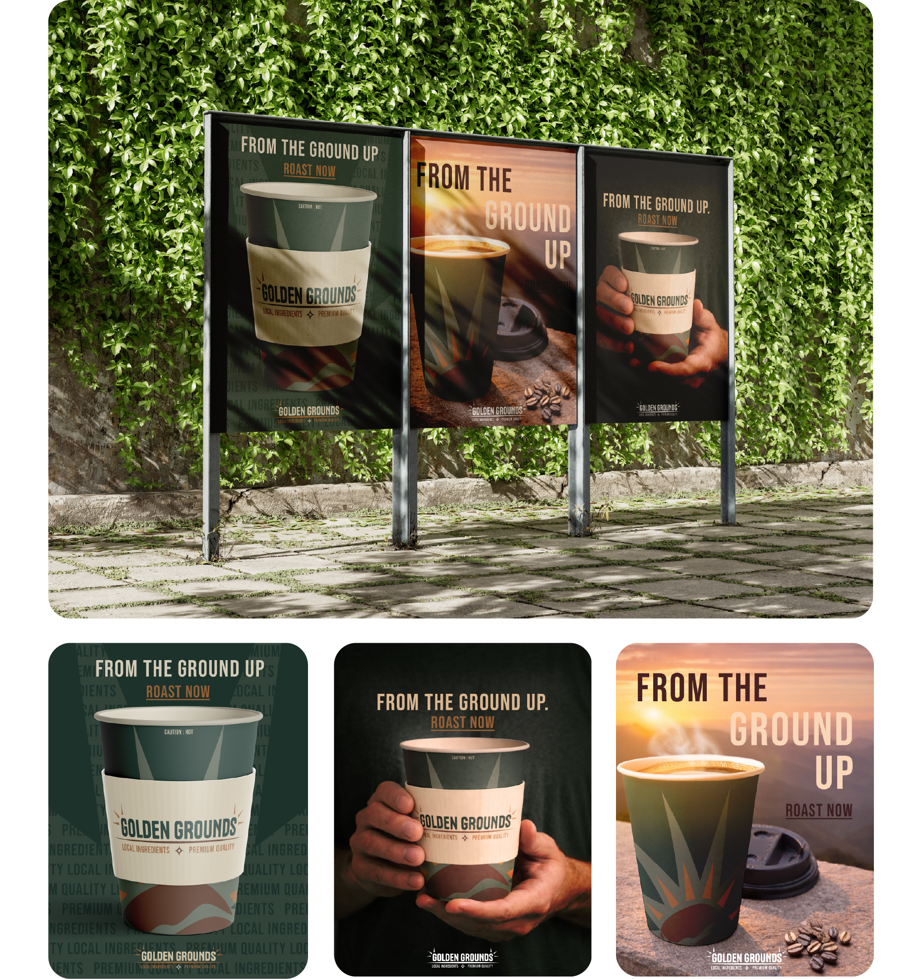 Mockup advertisements for a local, organic, and nature-based coffee company located in Denver Colorado named Golden Grounds. Designed Adobe Photoshop and also used for the mockups.